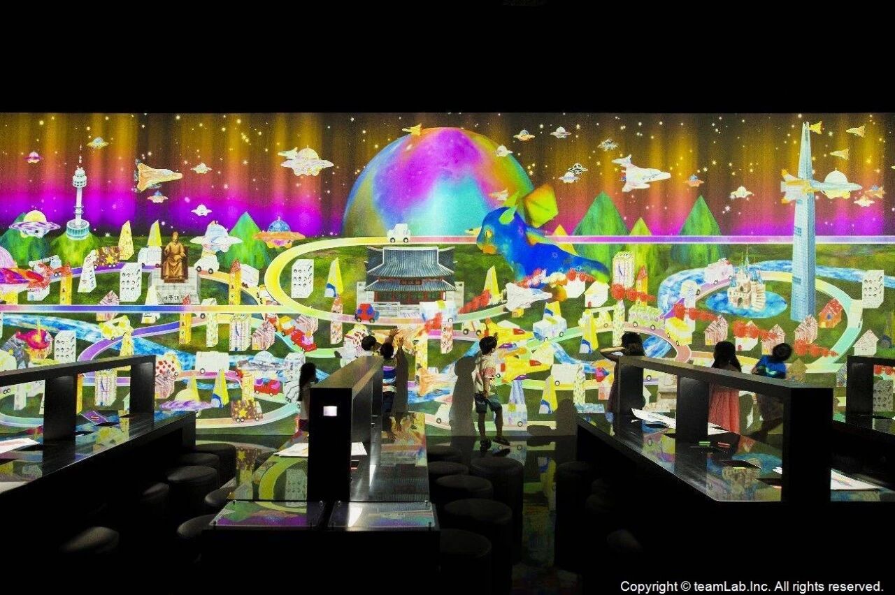 城镇会随着孩子们的涂绘发展演变。孩子们在纸上画好汽车、建筑、不明飞行物和宇宙飞船后,纸张被扫描并投影到大屏幕上成为一个虚拟三维城镇。